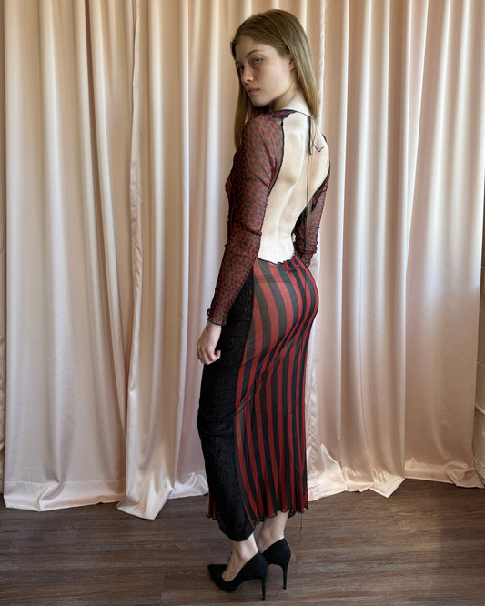 Jean Paul Gaultier S/S 1996 “Cyberbaba” Open Back Striped Mesh Long Sleeve Dress