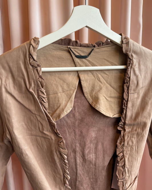 Sisii Faded Pink Ruffle Trim Waist Tie Leather Jacket