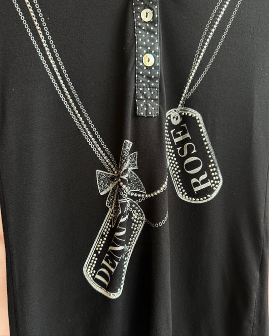 Italian Brand Dog Tag Necklace Rhinestone Print Black Polo Shirt