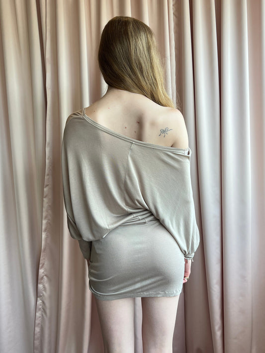 Tan Off Shoulder Batwing Jersey Mini Dress