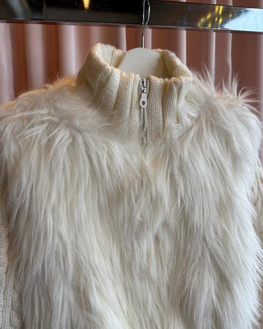 Heaven White Faux Fur Cable Knit Zip Up Sweater