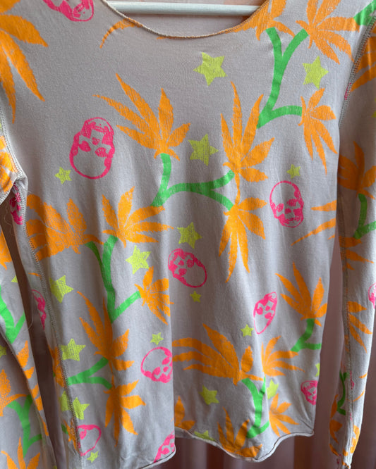 French Designer Neon Hemp Leaf Skull All Over Print Long Sleeve Top