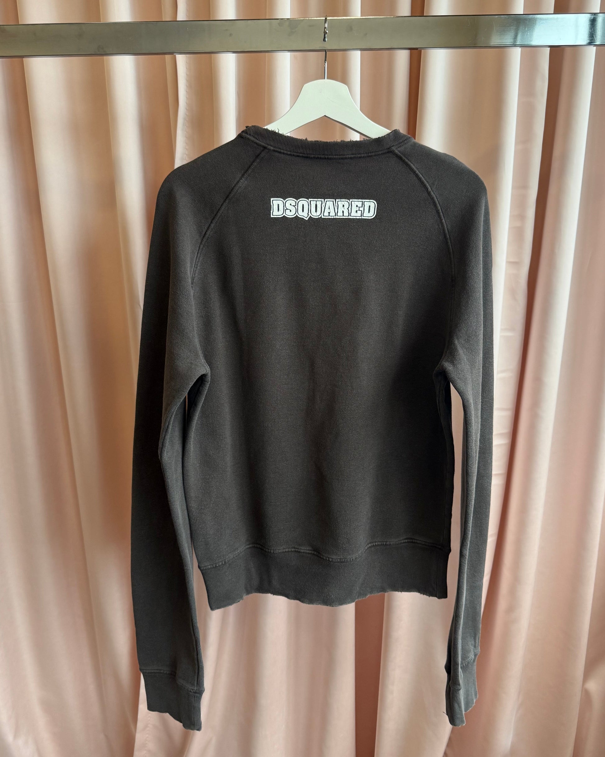 Beautifully faded dark brown crewneck sweatshirt with a text graphic that reads "Ranger" on the front and "Dsquared" logo graphic on the back. Pre-distressed edges. Content info tag has faded.