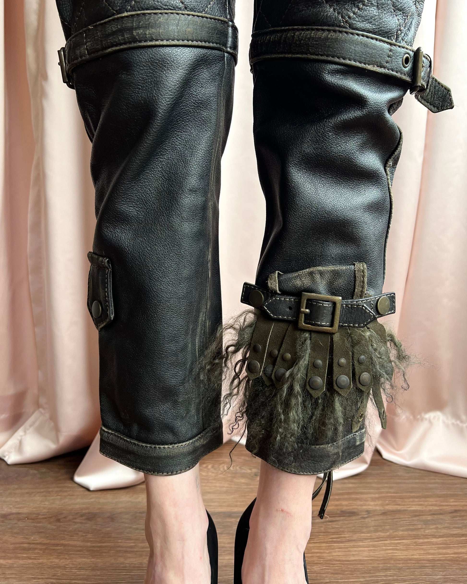 A truly showstopping pair of genuine leather biker pants from Dsquared²'s Fall/Winter 2005 collection. Crafted from a heavyweight dark brown leather which has been intentionally faded and distressed to create a worn in look. Featuring moto-inspired patchwork, quilted panels at the knees, adjustable buckle straps going down the legs, bronze tone hardware, and asymmetrically placed pockets trimmed with lamb fur. Similar leather biker pants and matching leather biker jacket with lamb fur trim were shown on the runway. Coming in excellent condition, these grail-worthy pants are exemplary of Dsquared²'s top tier craftsmanship and attention to detail.