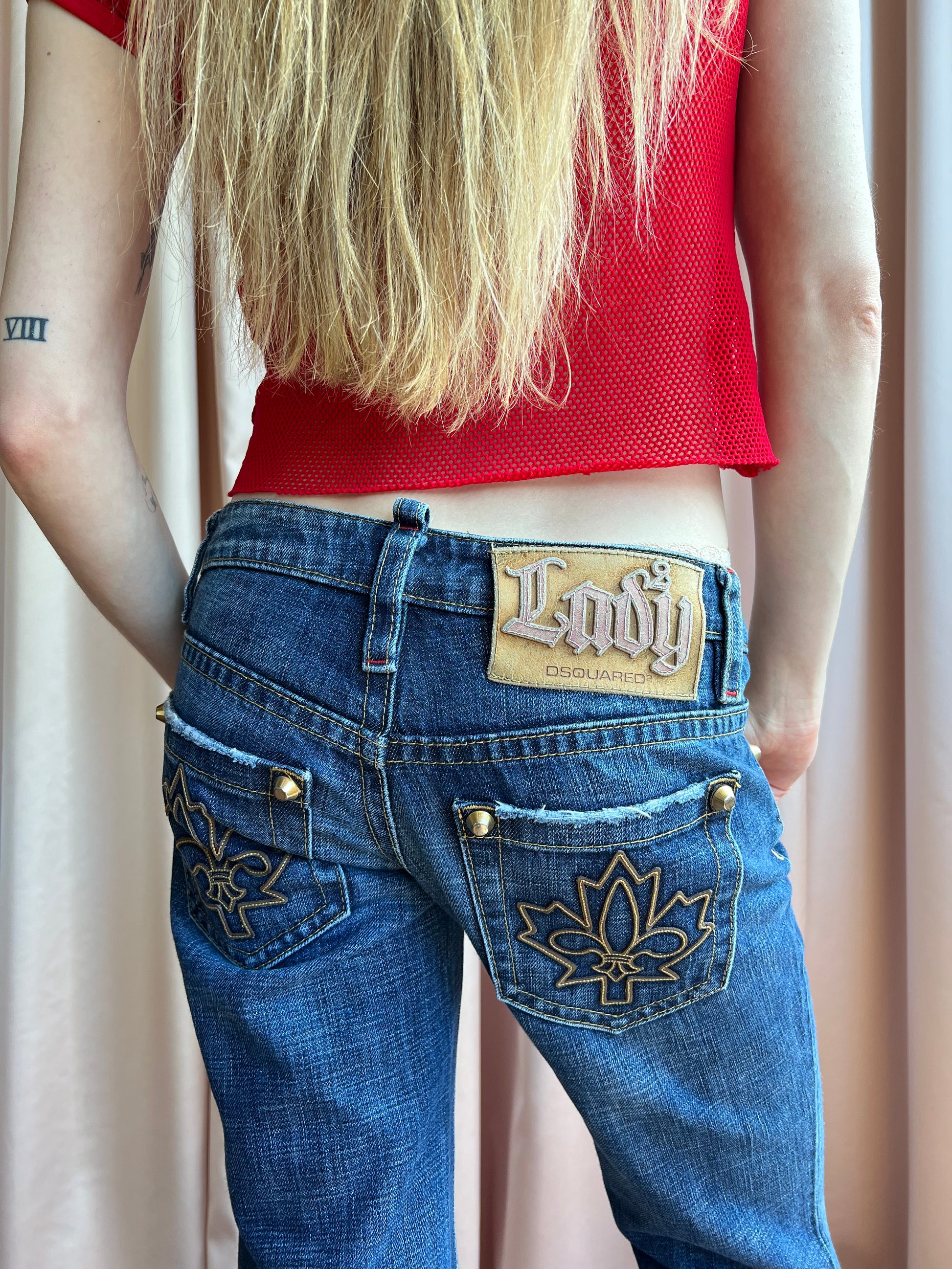 As seen on the runway for Dsquared²’s Fall/Winter 2006 collection. Low rise flare leg cut denim featuring studding, red contrast stitching, embroidered “Lady” leather back patch, and embroidered maple leaf and fleur de lis leather appliqués on the back pockets. General wear and heel drag as shown in photos.