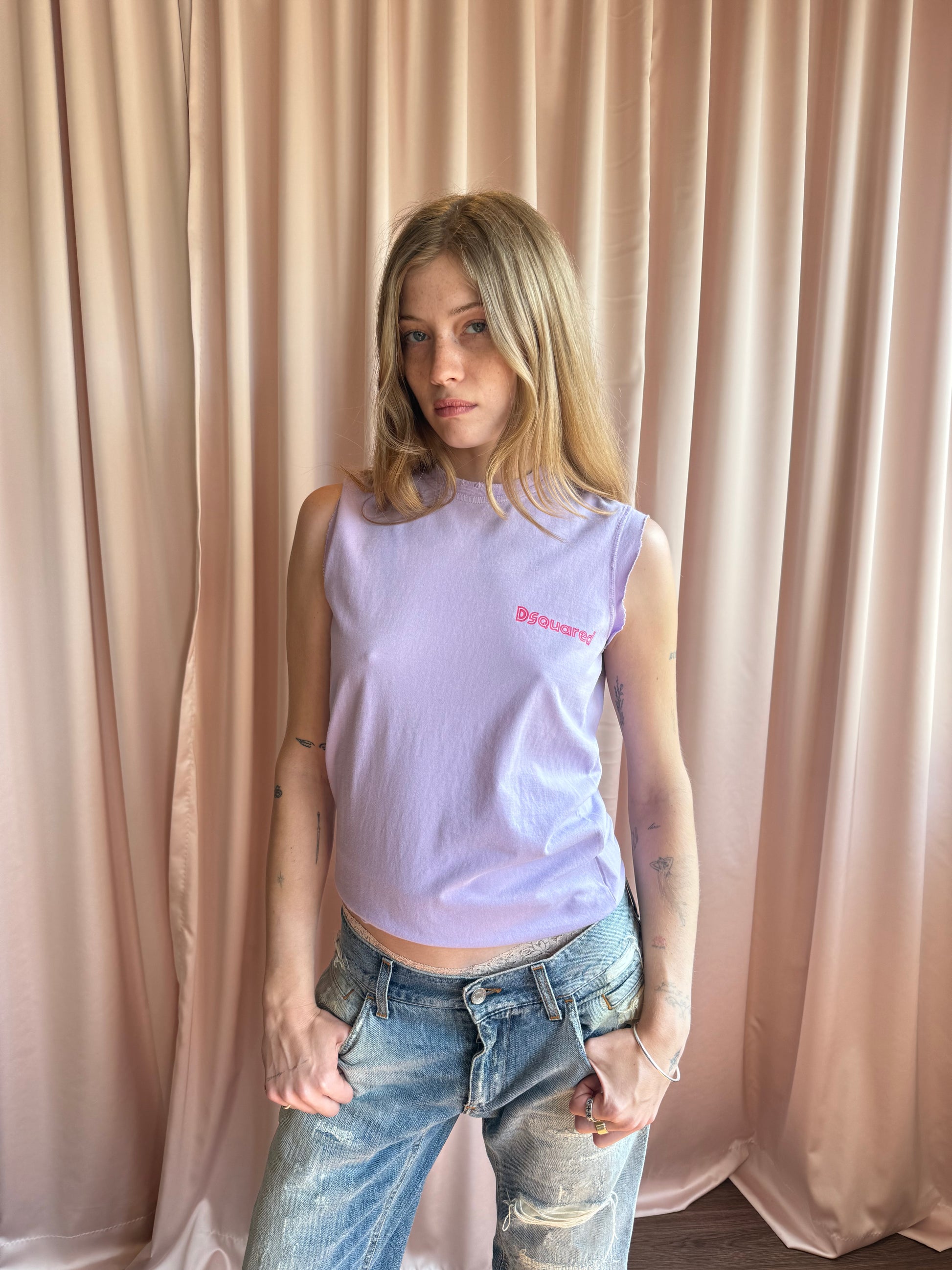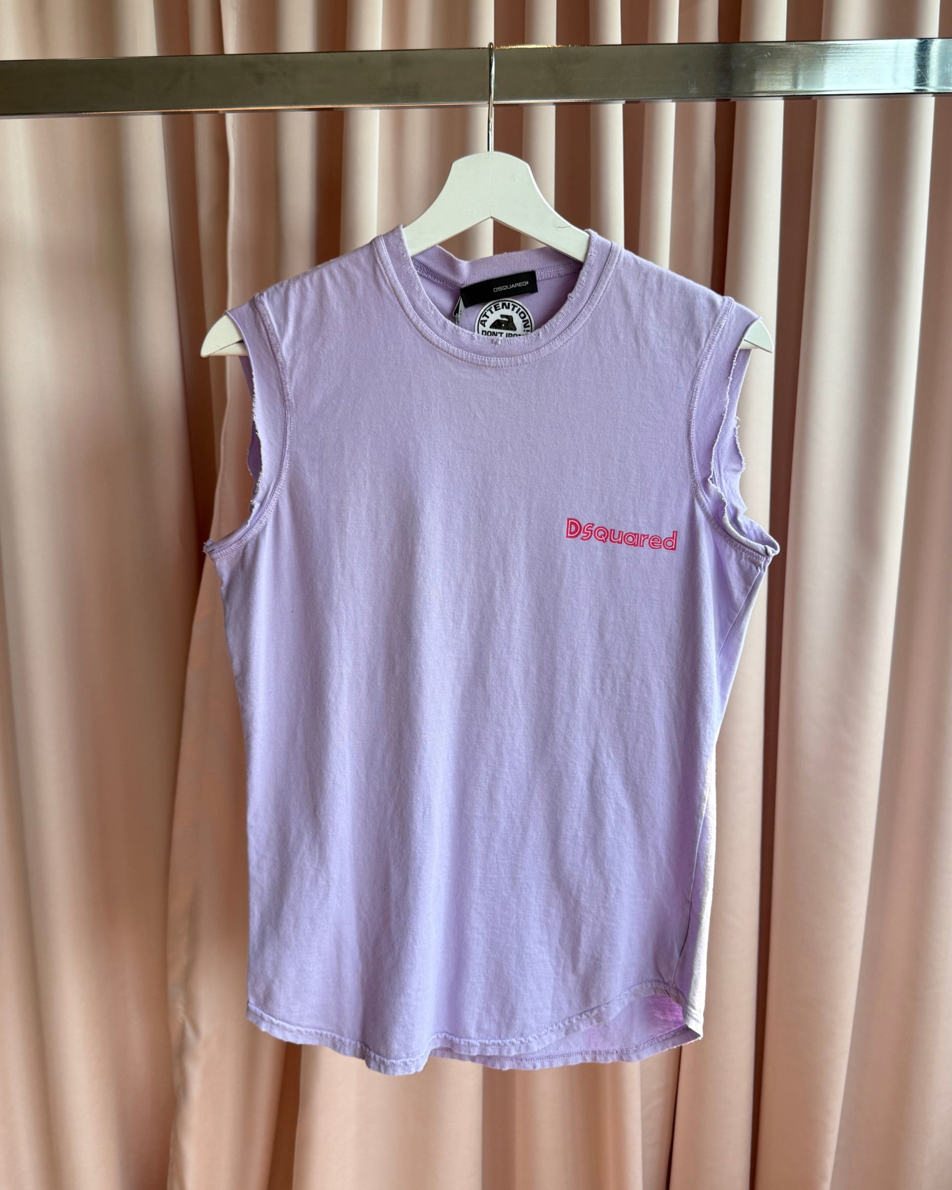 As seen on the runway for the Dsquared² Spring/Summer 2004 Men's collection, this tank comes in a beautiful lavender purple colour with hot pink writing that reads "For Women Only" on the back and a logo graphic on the front. Cutoff style with intentional distressing along the sleeve openings and neckline. Coming in brand new condition with original tags attached.