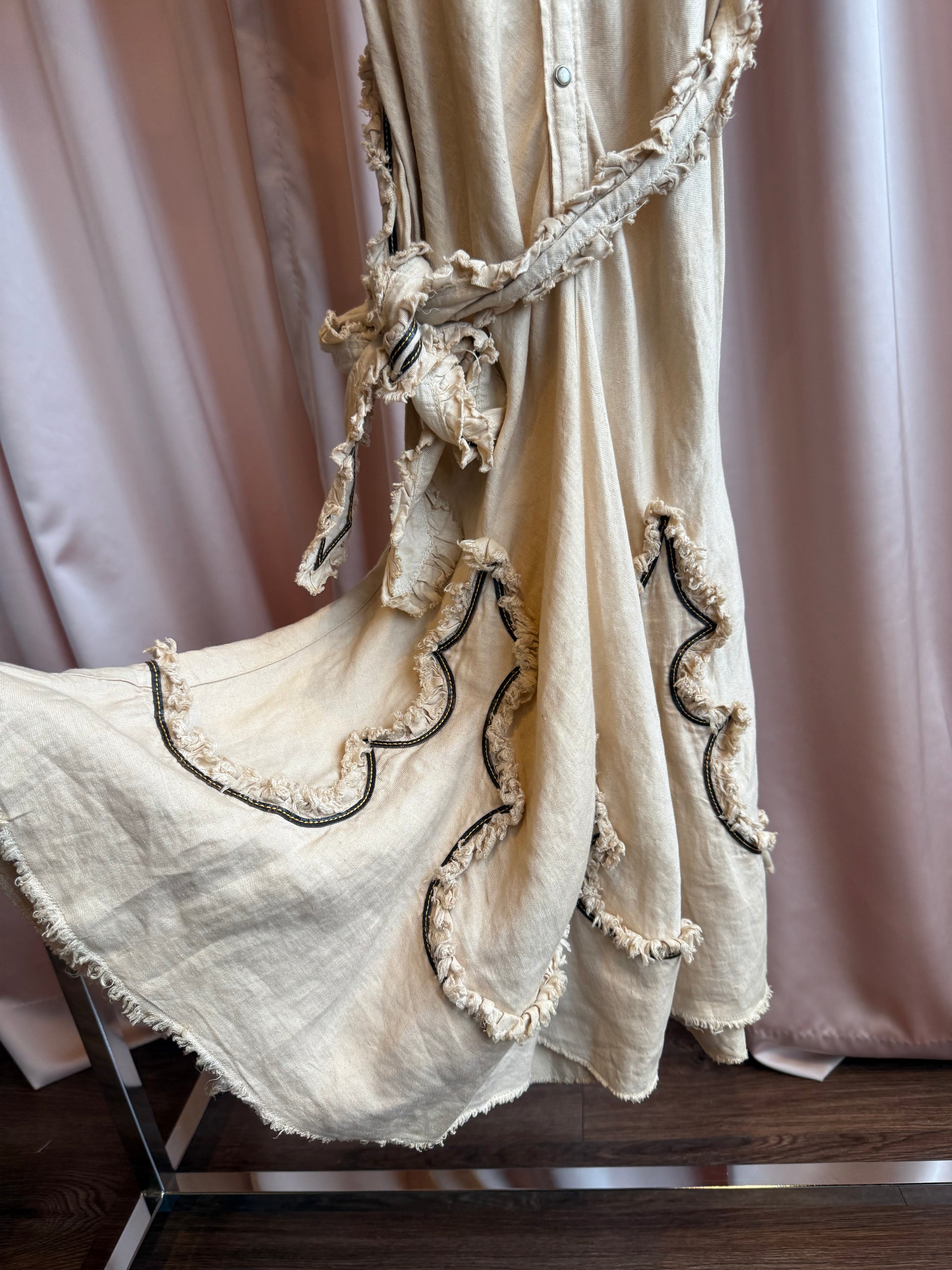 As seen on the runway for Dsquared²'s Spring/Summer 2006 collection, this western inspired dress comes in a tan linen with dark brown faux leather trim. Featuring snap buttons going all the way down the front, puff sleeve shoulders, pointed collar, distressed edge panelling, and belted waist.