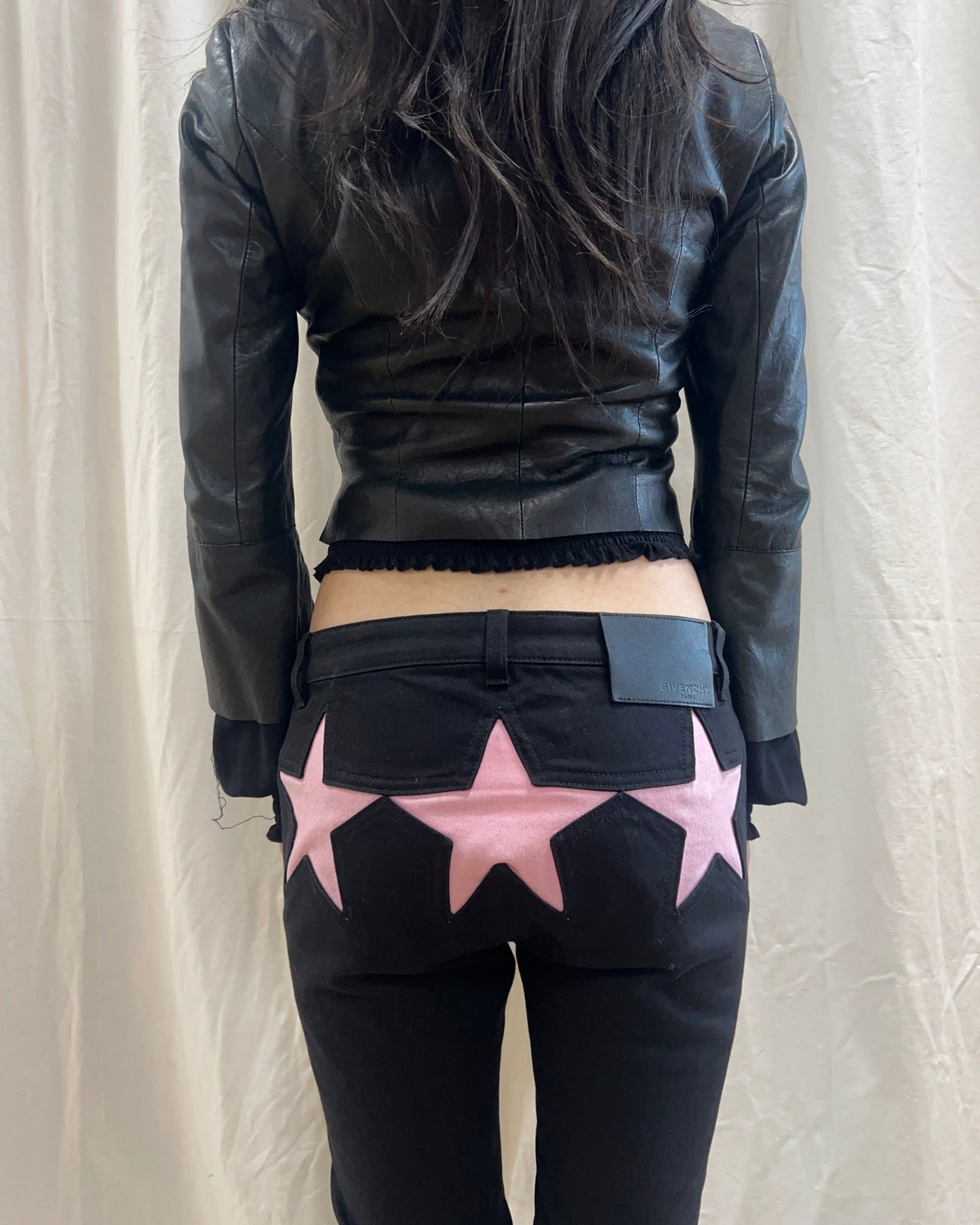 From Givenchy's Pre-Fall 2017 collection. Black low rise skinny fit jeans featuring three baby pink stars across the back.