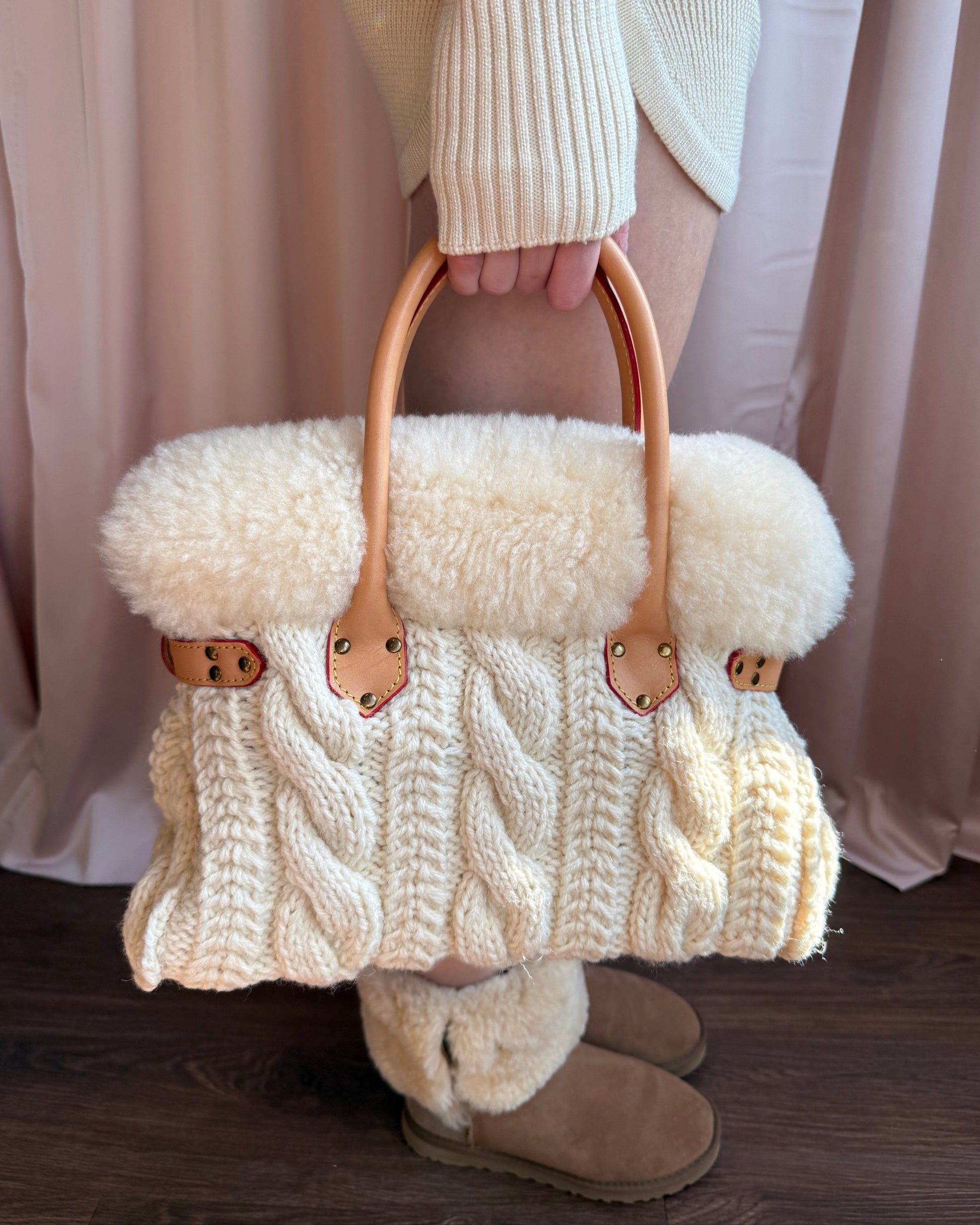 Beautiful cream tone cable knit and shearling handbag, featuring tan leather straps, detachable round shearling coin purse, and functional gold-tone lock and key closure. Lined in canvas featuring a zipper pocket on the inner side and double compartment open pockets on the other side. In flawless condition.