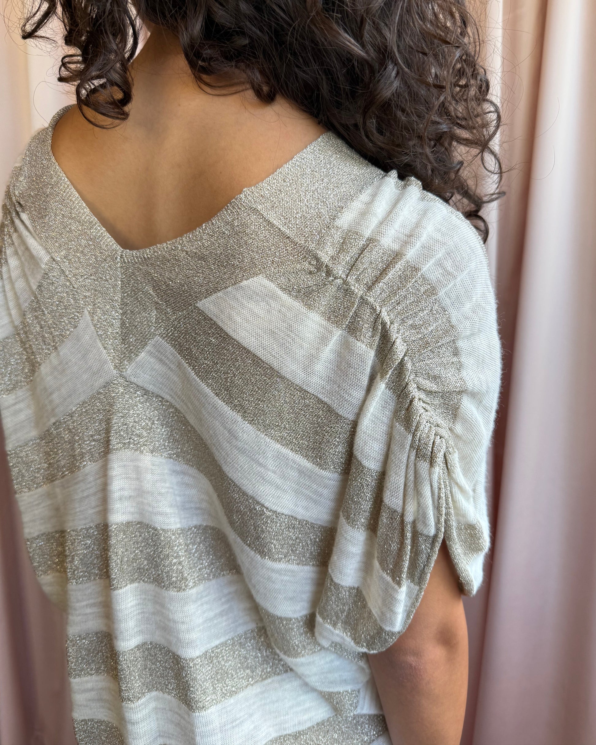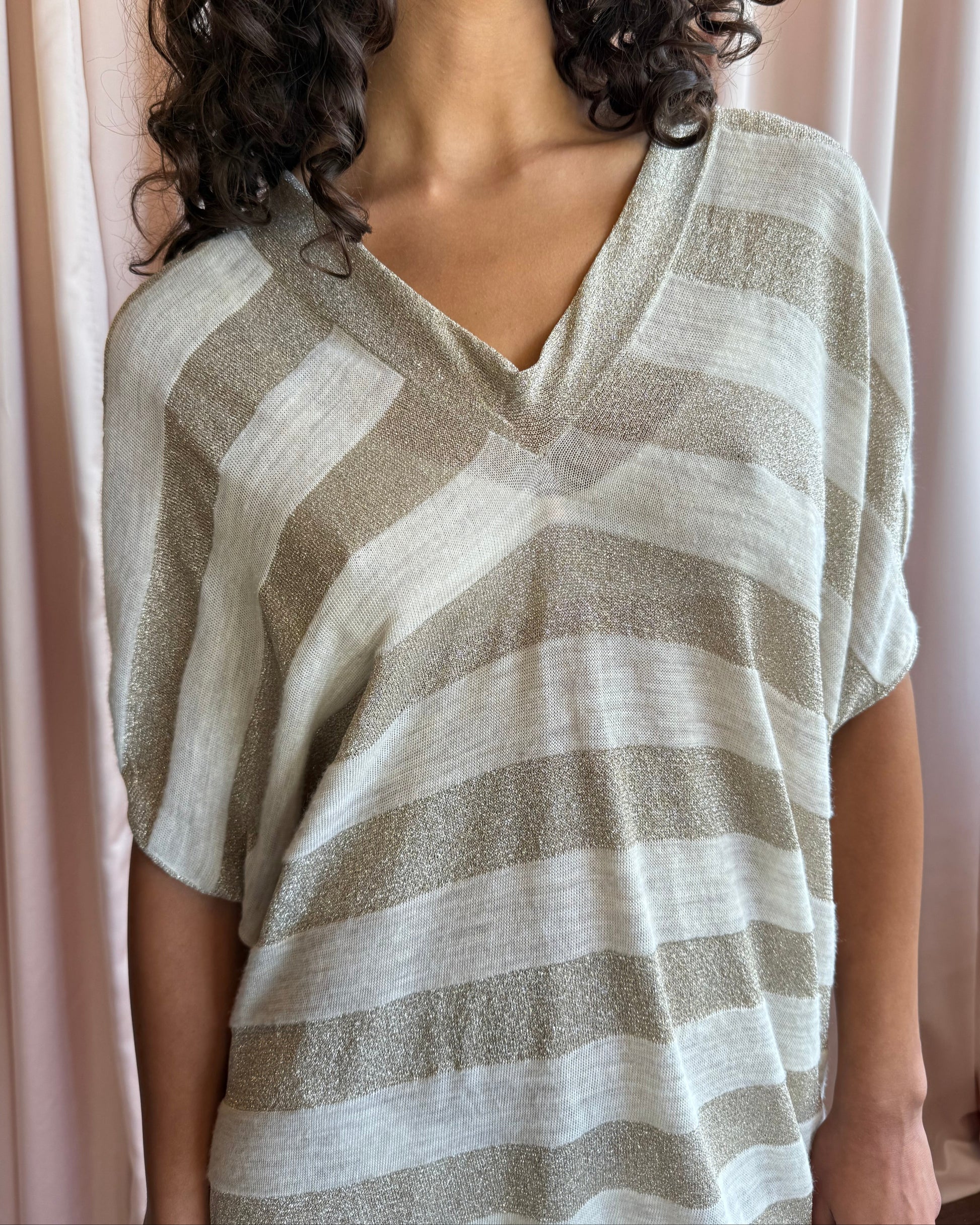 Japanese Brand Shimmer Striped Knit V-Neck Mini Dress