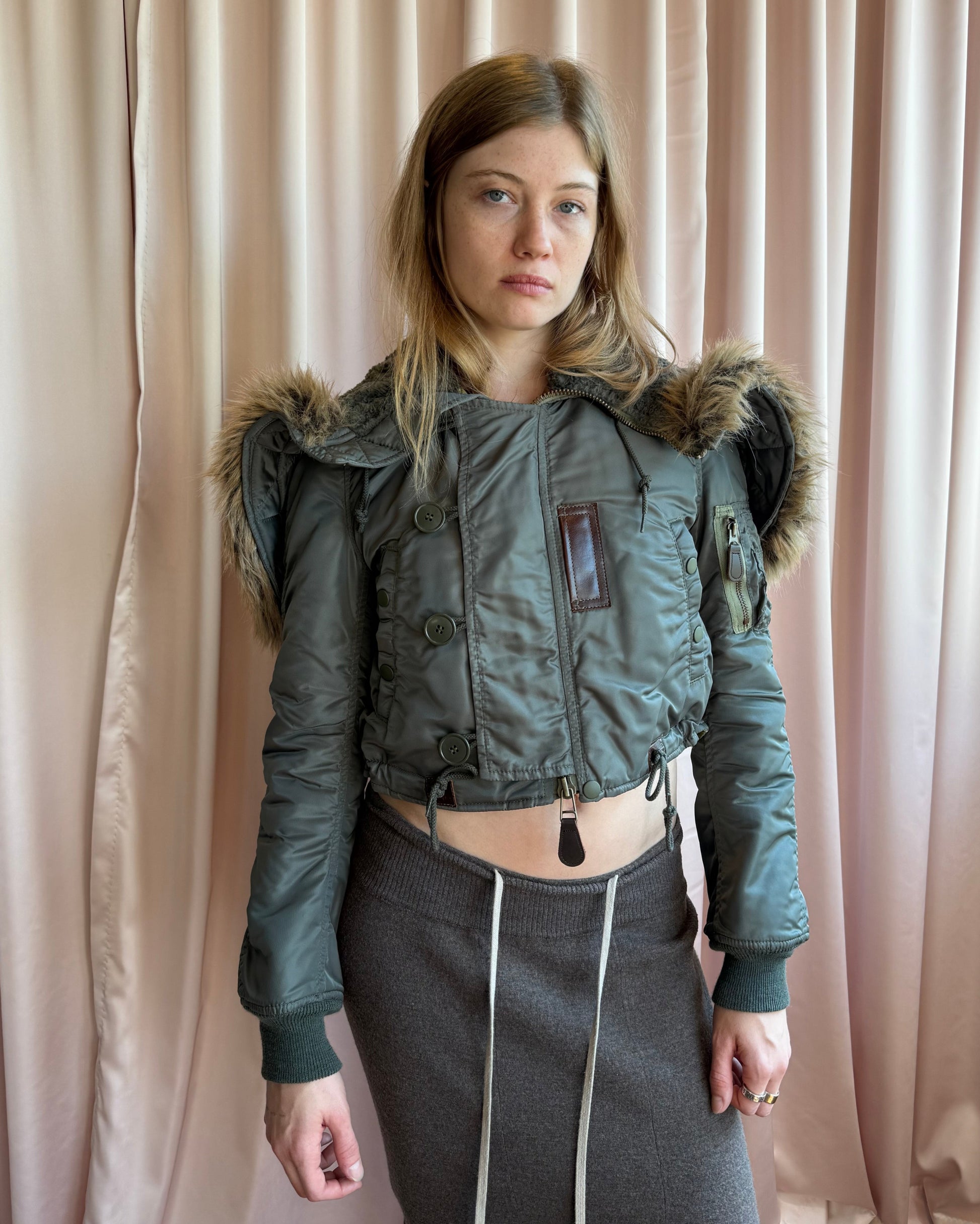 Incredible cropped bomber jacket as seen on the runway in Look 39 for Junya Watanabe's Fall/Winter 2010 collection for Comme des Garçons. Coming in an army green tone padded nylon, featuring a cropped fit, camouflage print lining, leather accents, full zip hood with faux fur trim, and buttoning over the zipper closure.