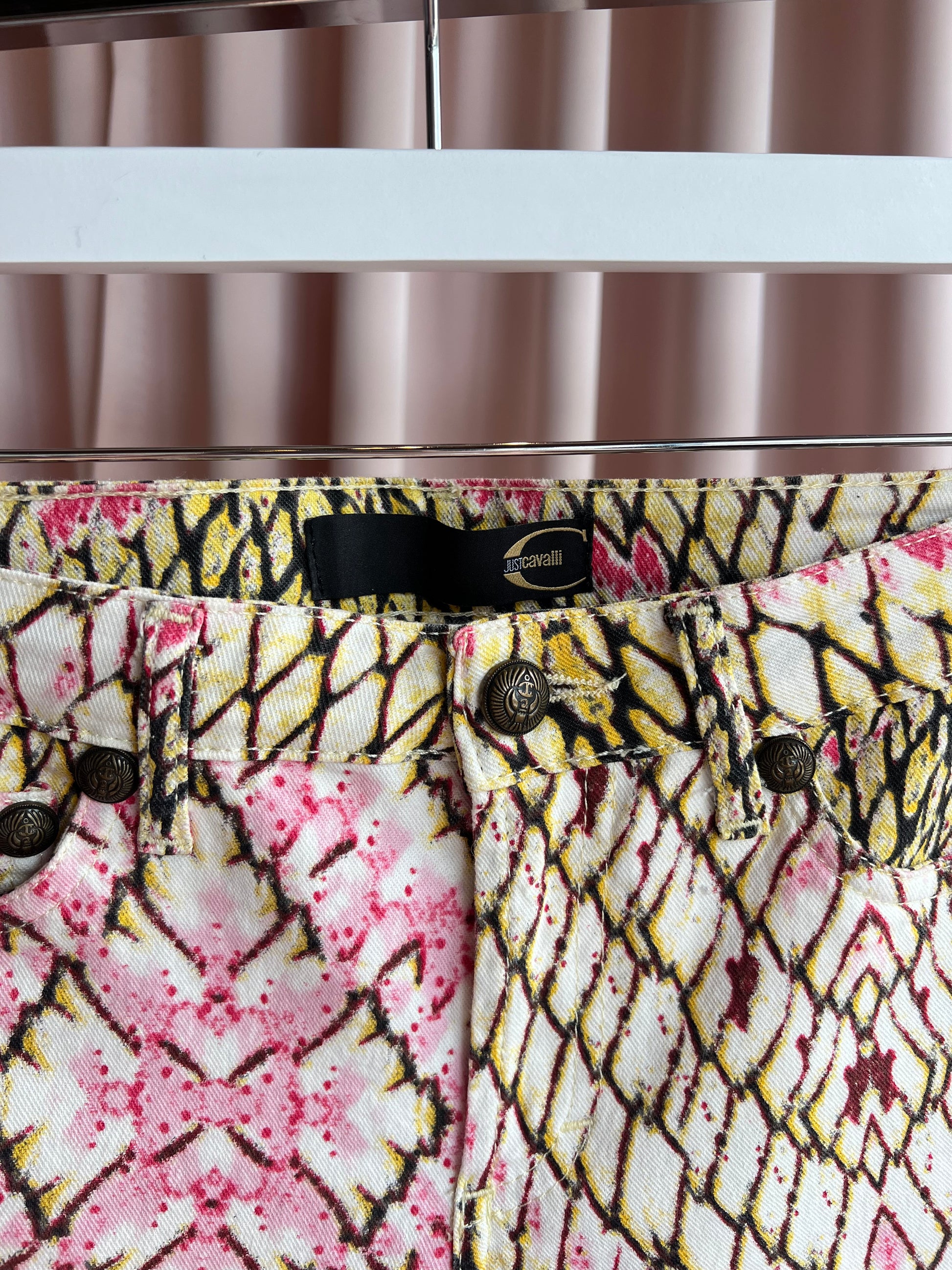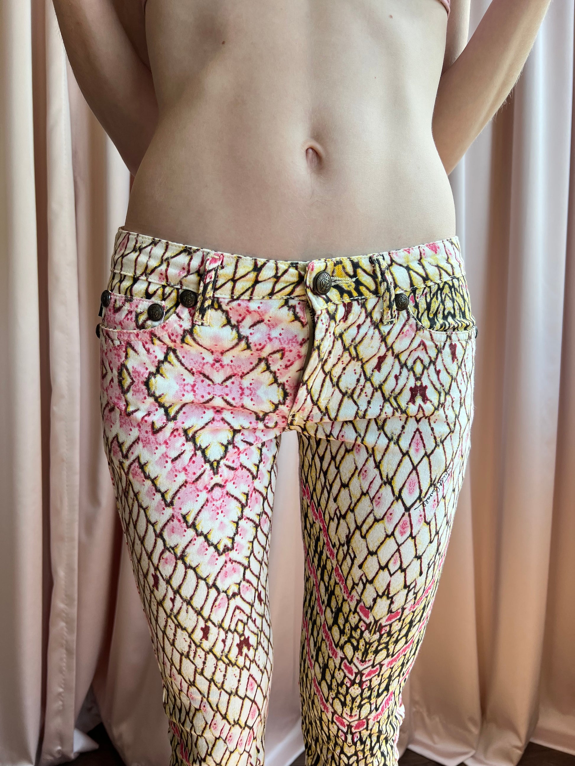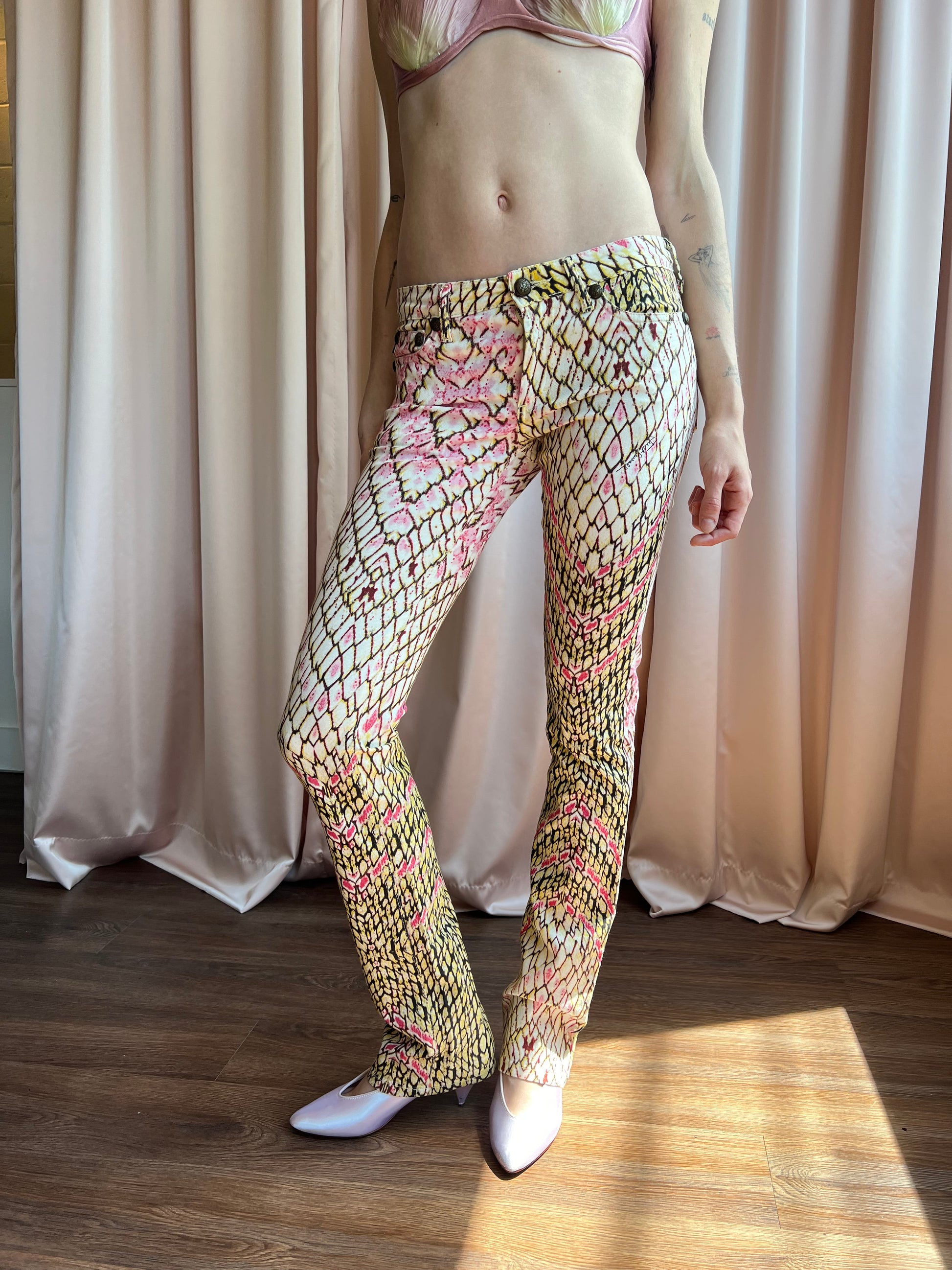 Just Cavalli jeans in a beautiful reptile print with glitter overlay speckled throughout. Mid rise bootcut fit in a stretch denim fabric. Metallic silver leather back patch.