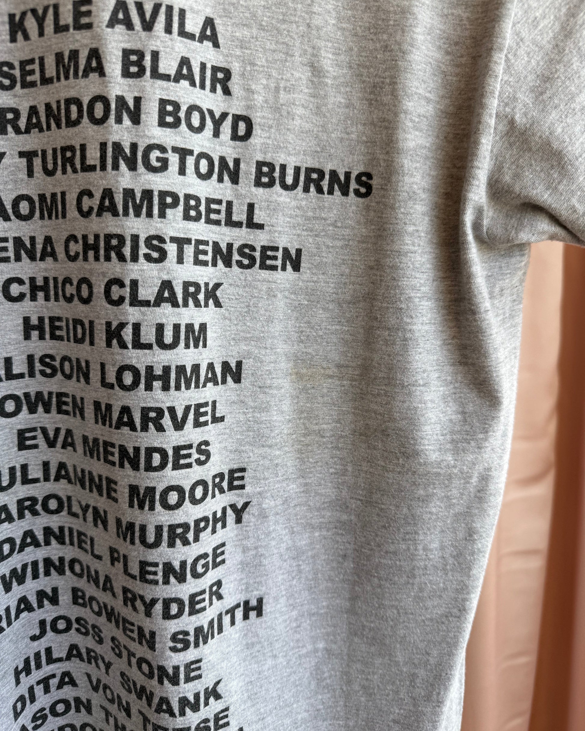This preloved t-shirt features Danish model Helena Christensen and comes in a heather grey. In preloved condition, with general wear, some staining, missing inner wash/info tags, and one pinhole at the bottom front of the shirt.