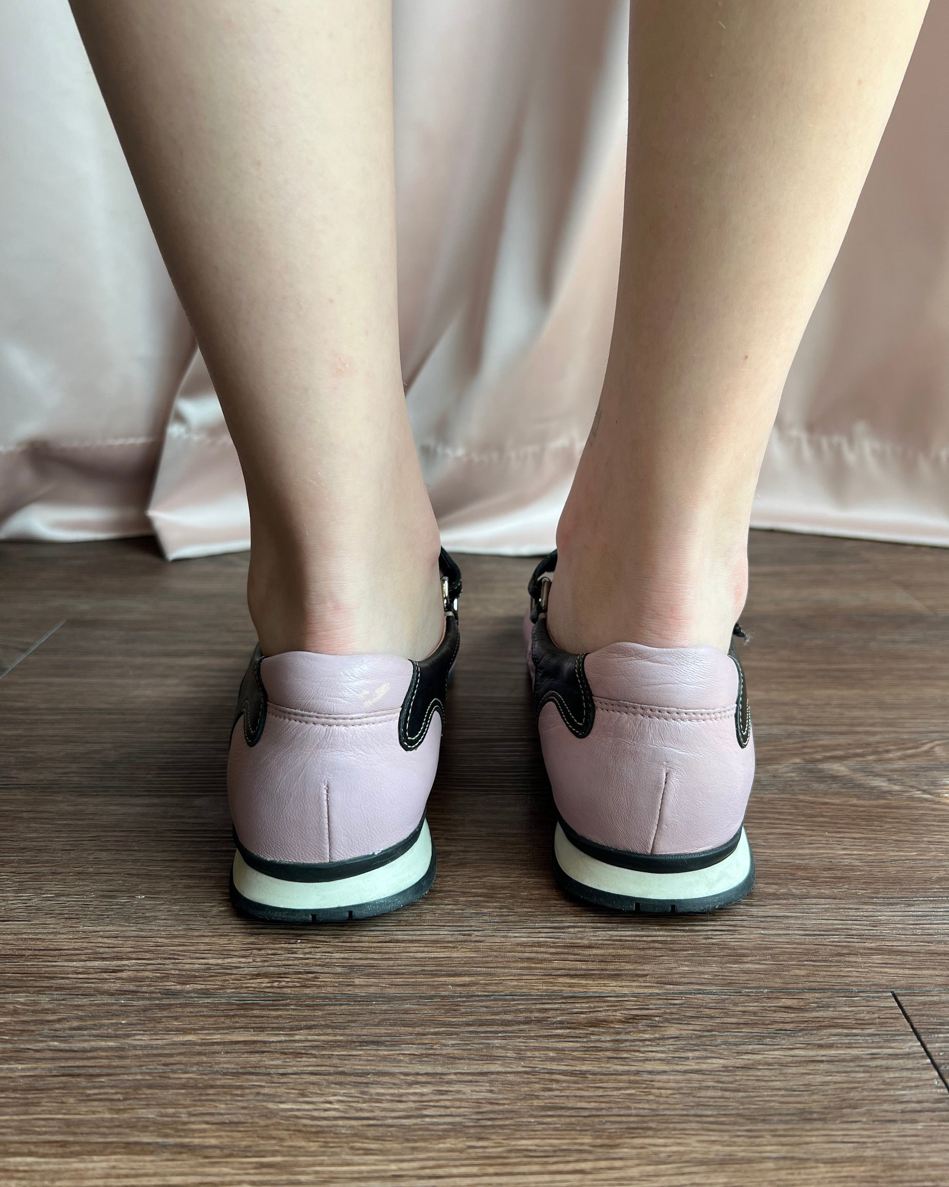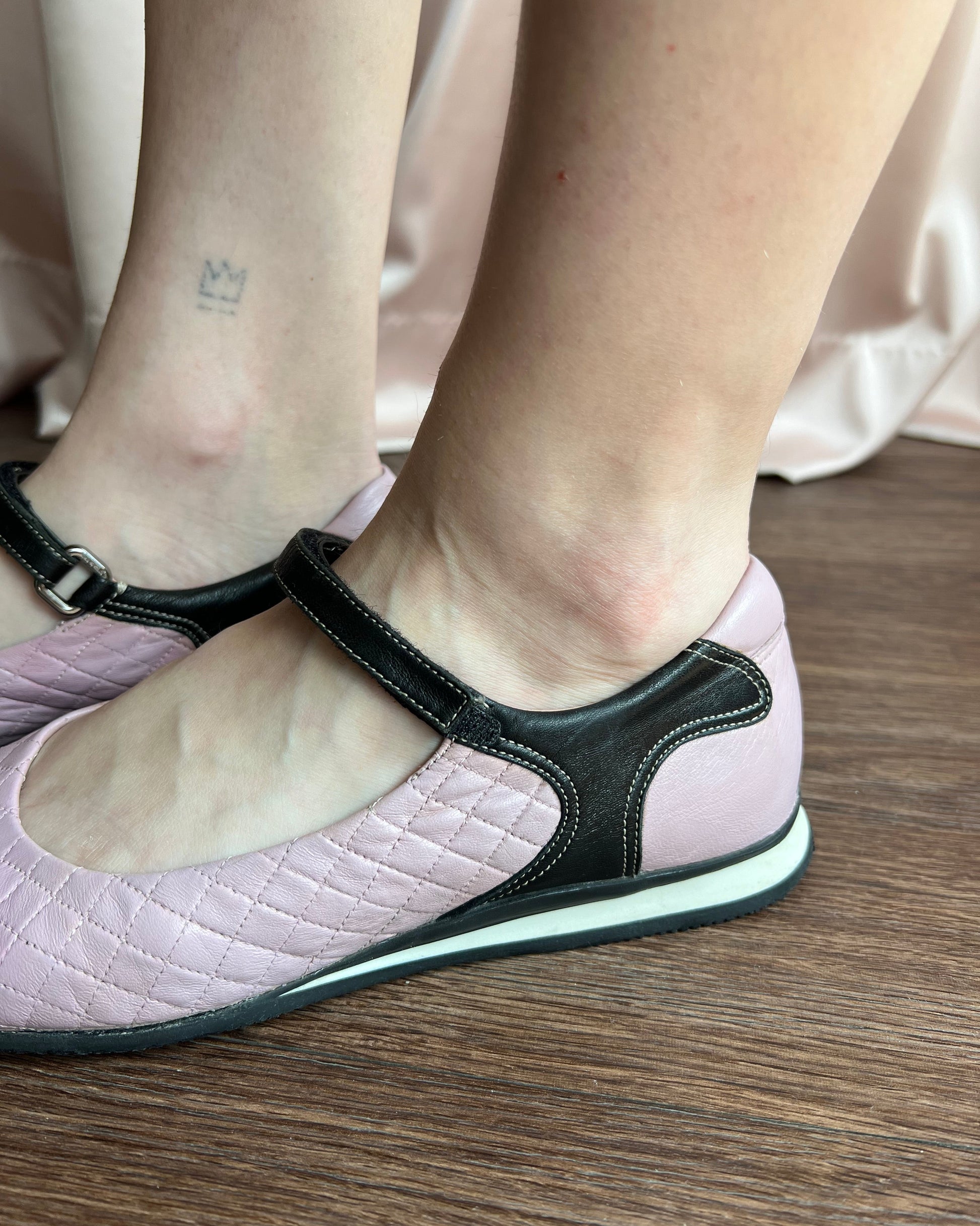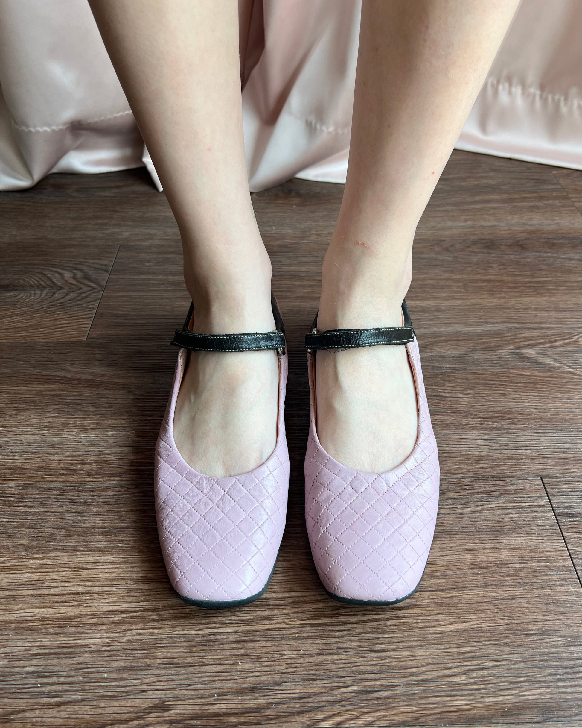 Sporty ballet flats featuring a baby pink quilted leather, square toe box, and black contrast accenting finished with a strap across the ankle.