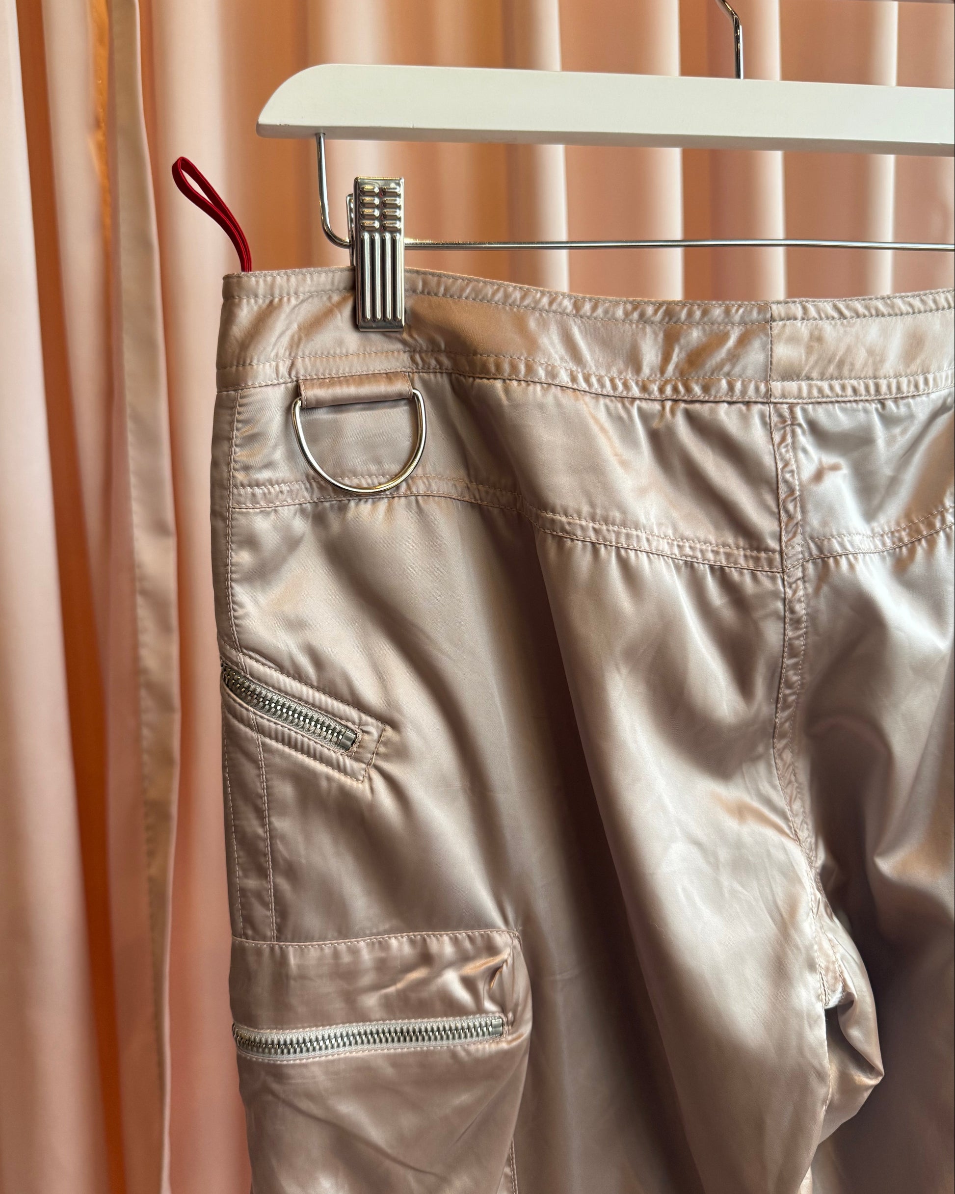 By 2000’s era Prada Sport, these cargo pants come in a beautiful dusty rose colour and satin nylon material. Low rise slim leg cut with adjustable ankle zippers. Many zippered cargo pockets and a D-ring at the back. In excellent condition with no flaws to note.
