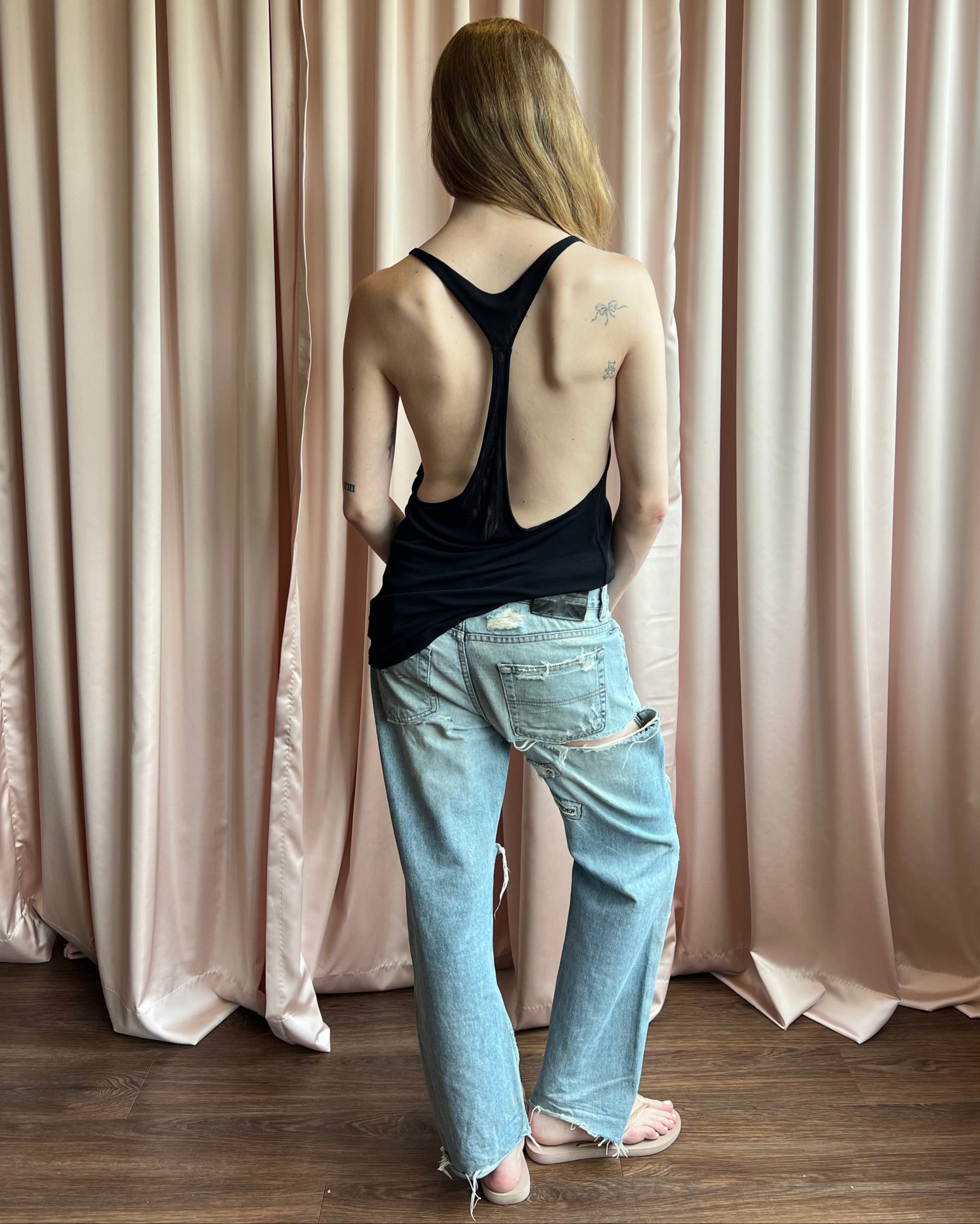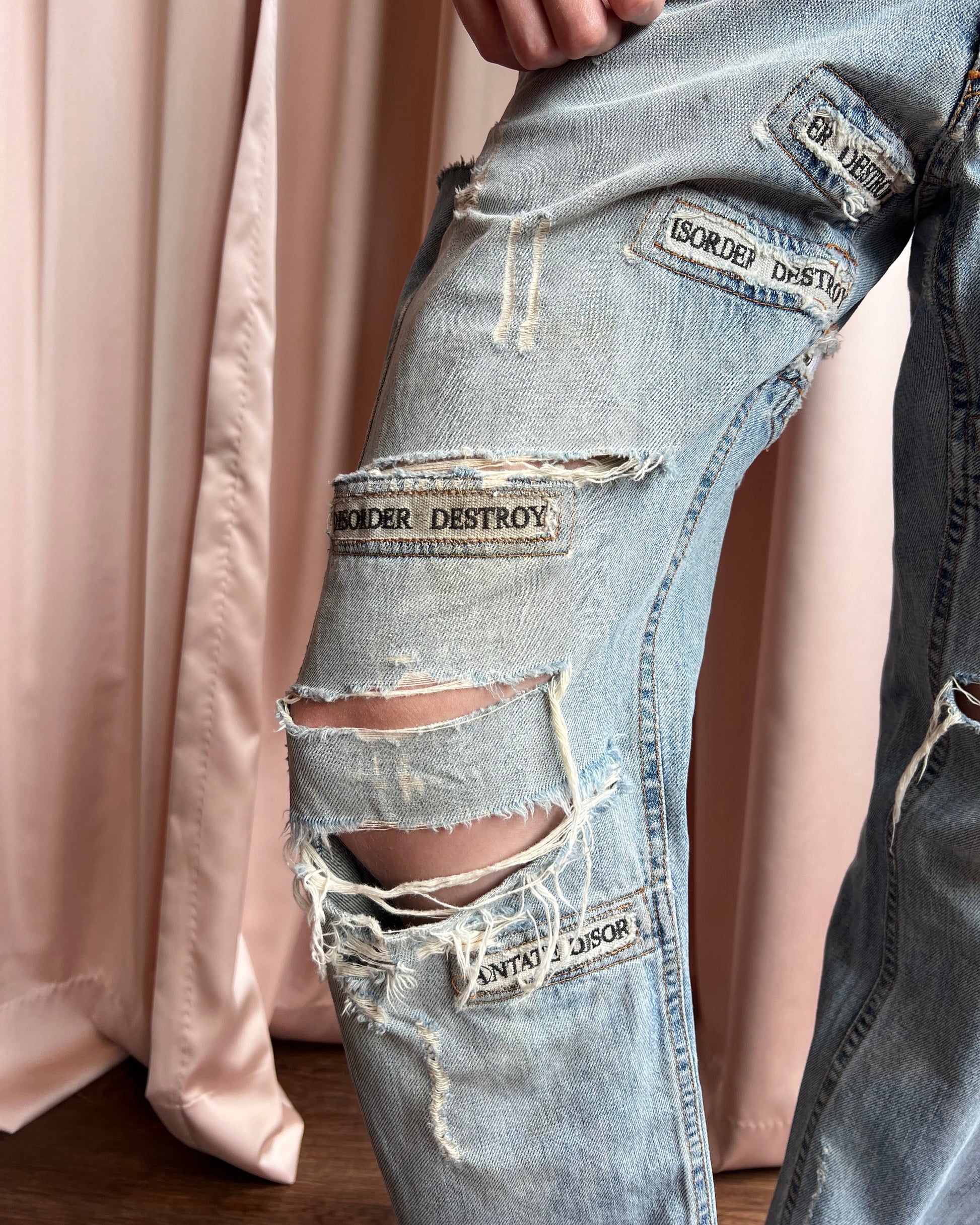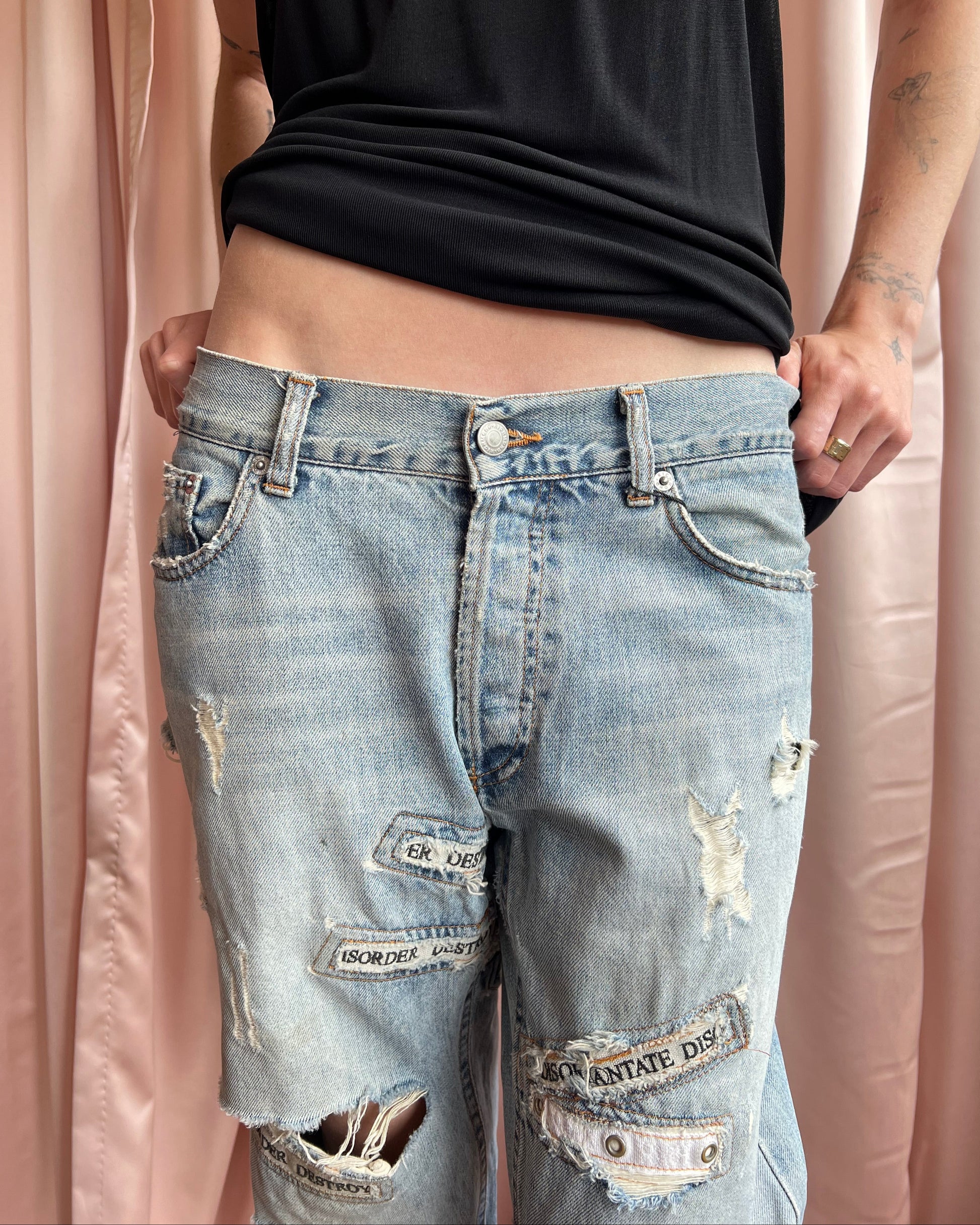 By John Richmond's Denim line, light wash baggy jeans featuring heavy distressing throughout that reveal embroidered text patches underneath, spelling out "Destroy", "Disorder", and "Disoriantate". Inner fabric content tag removed. Some light staining.