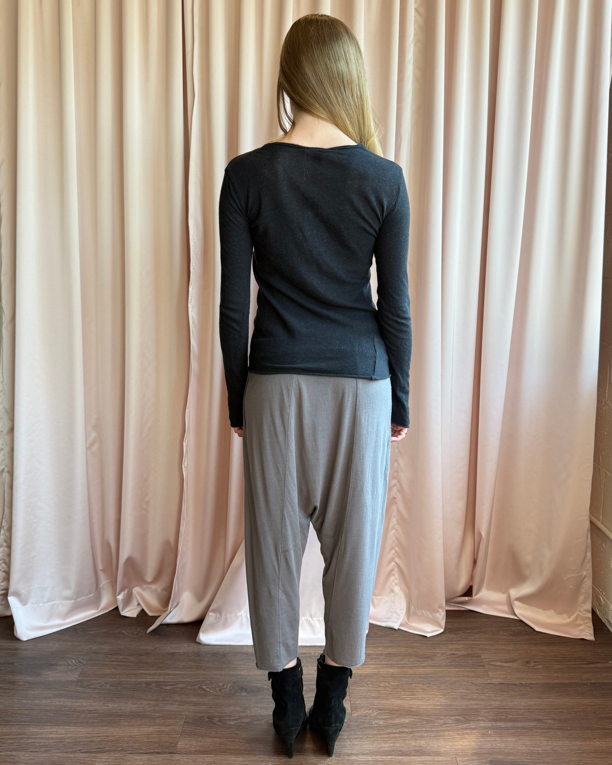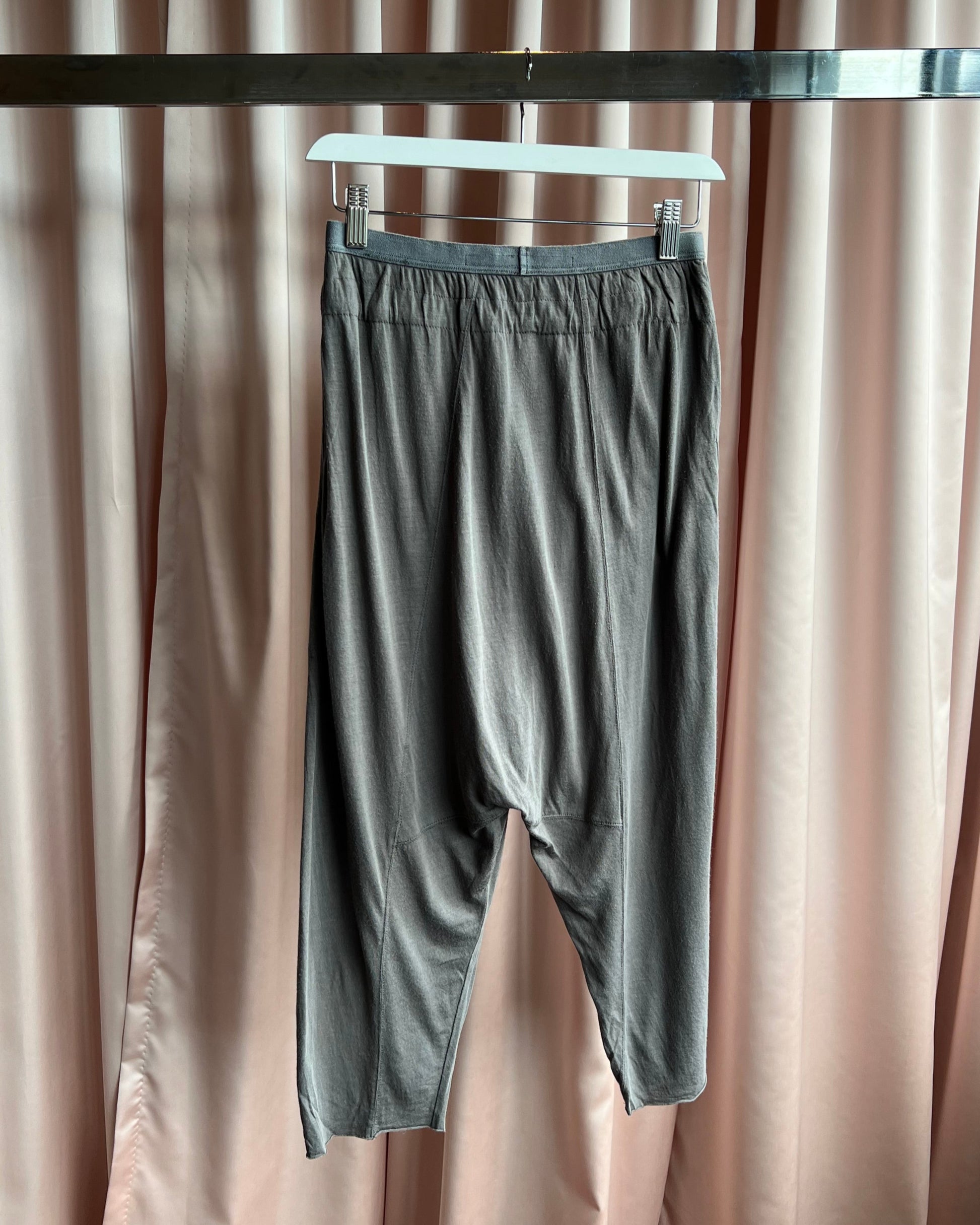 Drop crotch sarouel cropped drawstring joggers in a lightweight grey jersey fabric. Overall good condition, main flaws are pilling throughout and missing wash tags (therefore era/fabric content/origin country are unknown).