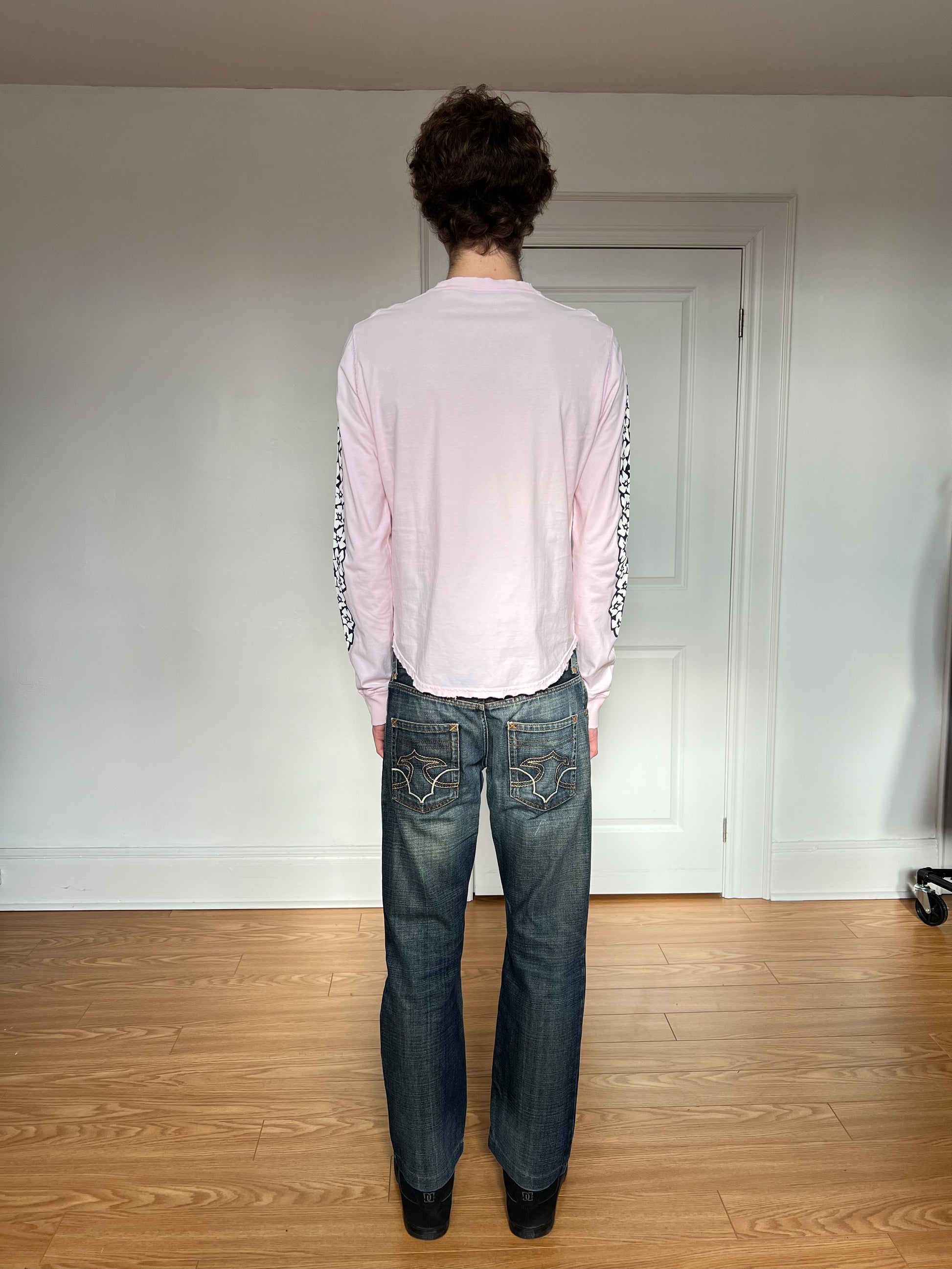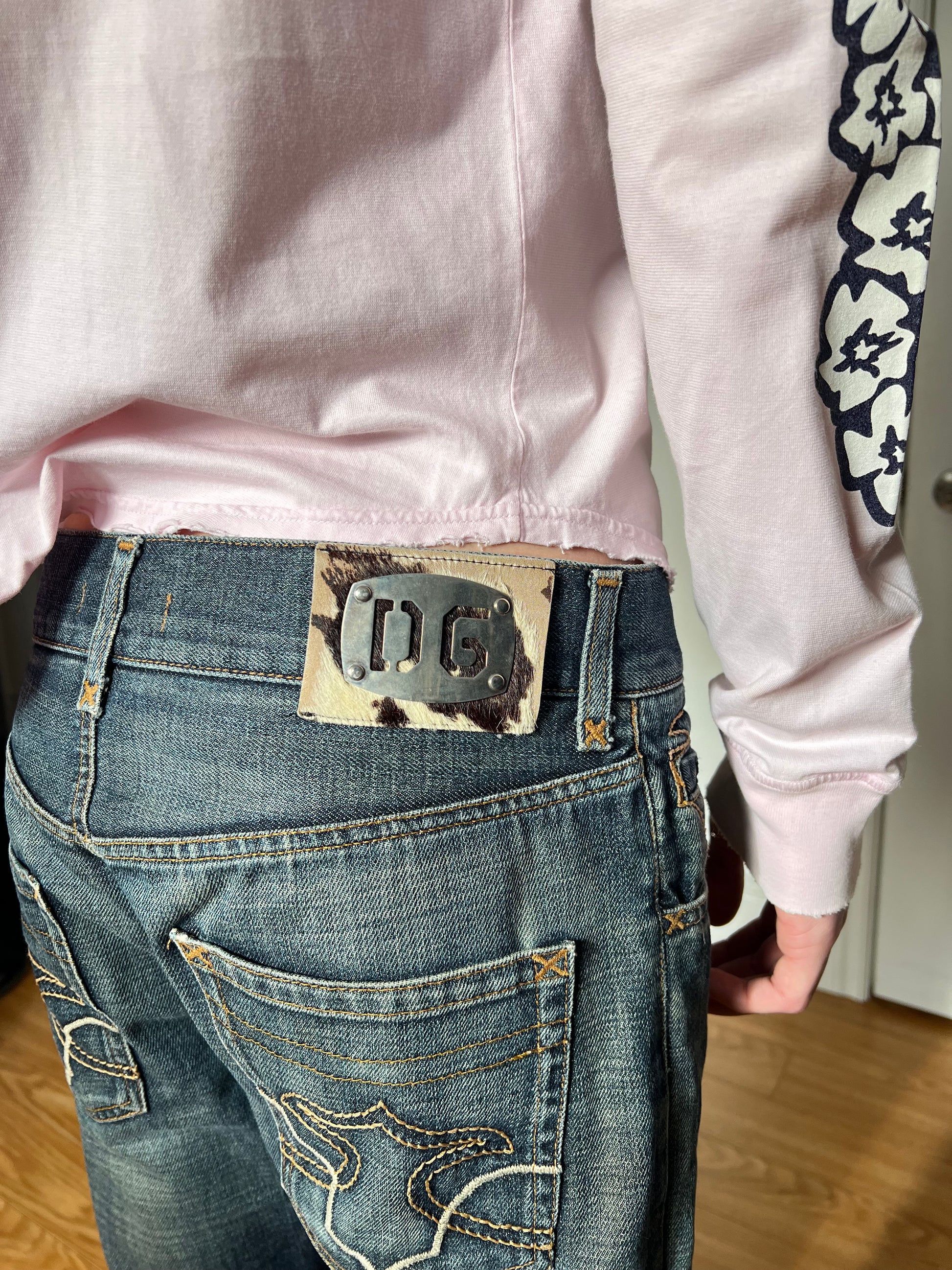 Straight leg faded denim featuring western inspired embroidered accents and a cowhide metal logo plate back patch. General wear with a small area of distressing near the fly, some distressing on the bottom hems, significant amount of the cow hide fur has rubbed off.