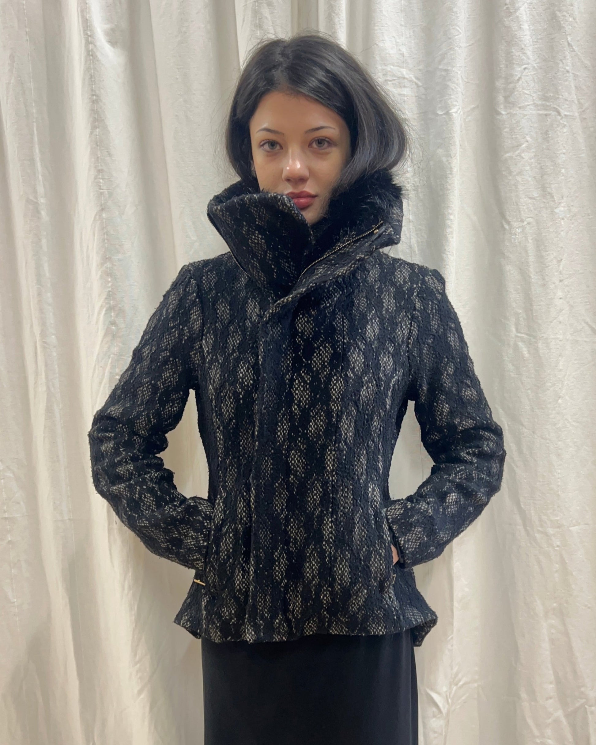 Can be worn funnel neck or moto style. Content information tag has been removed. General wear with some pilling, overall good condition. Zipper closure with button closure over top, a few buttons are loose but still attached.