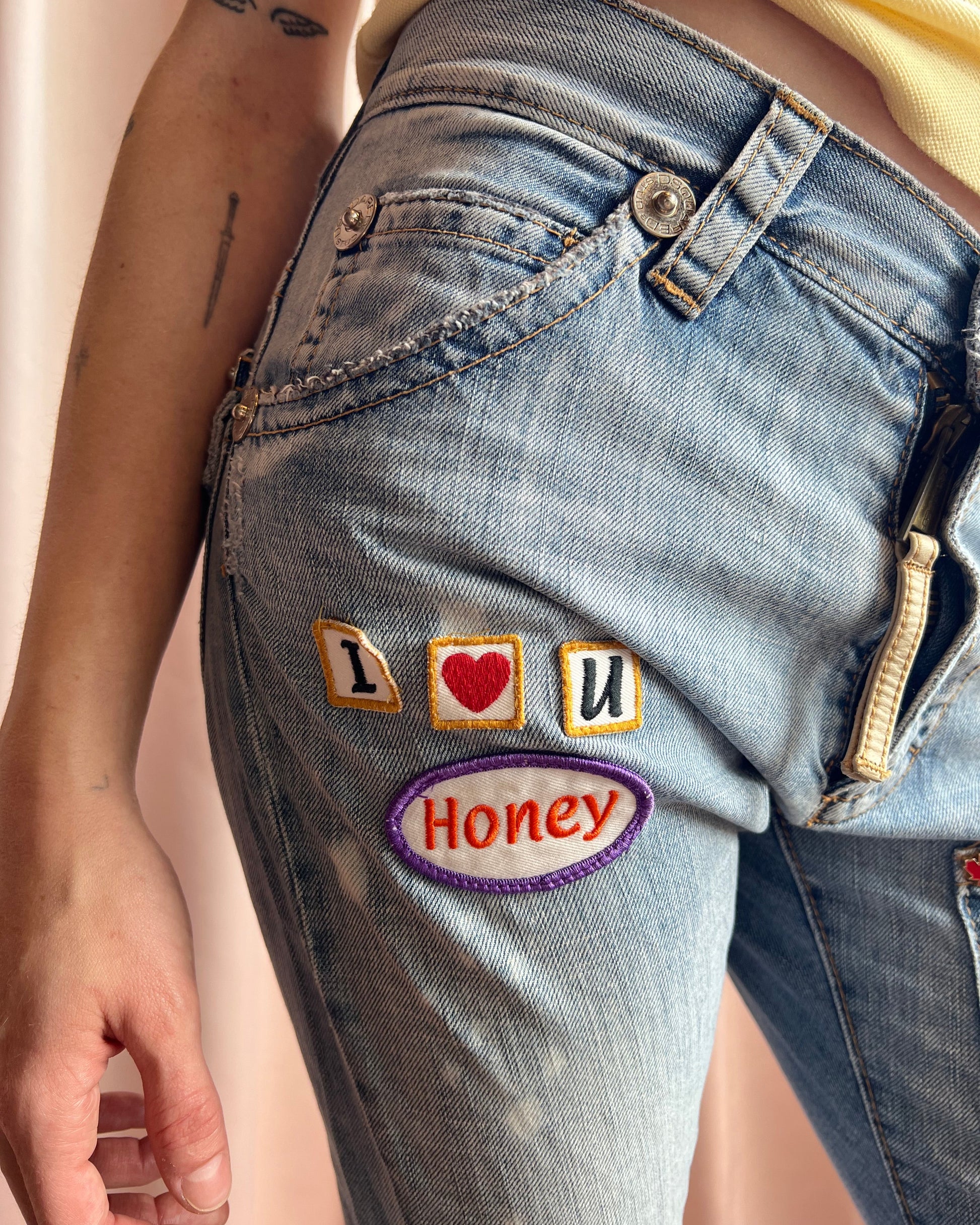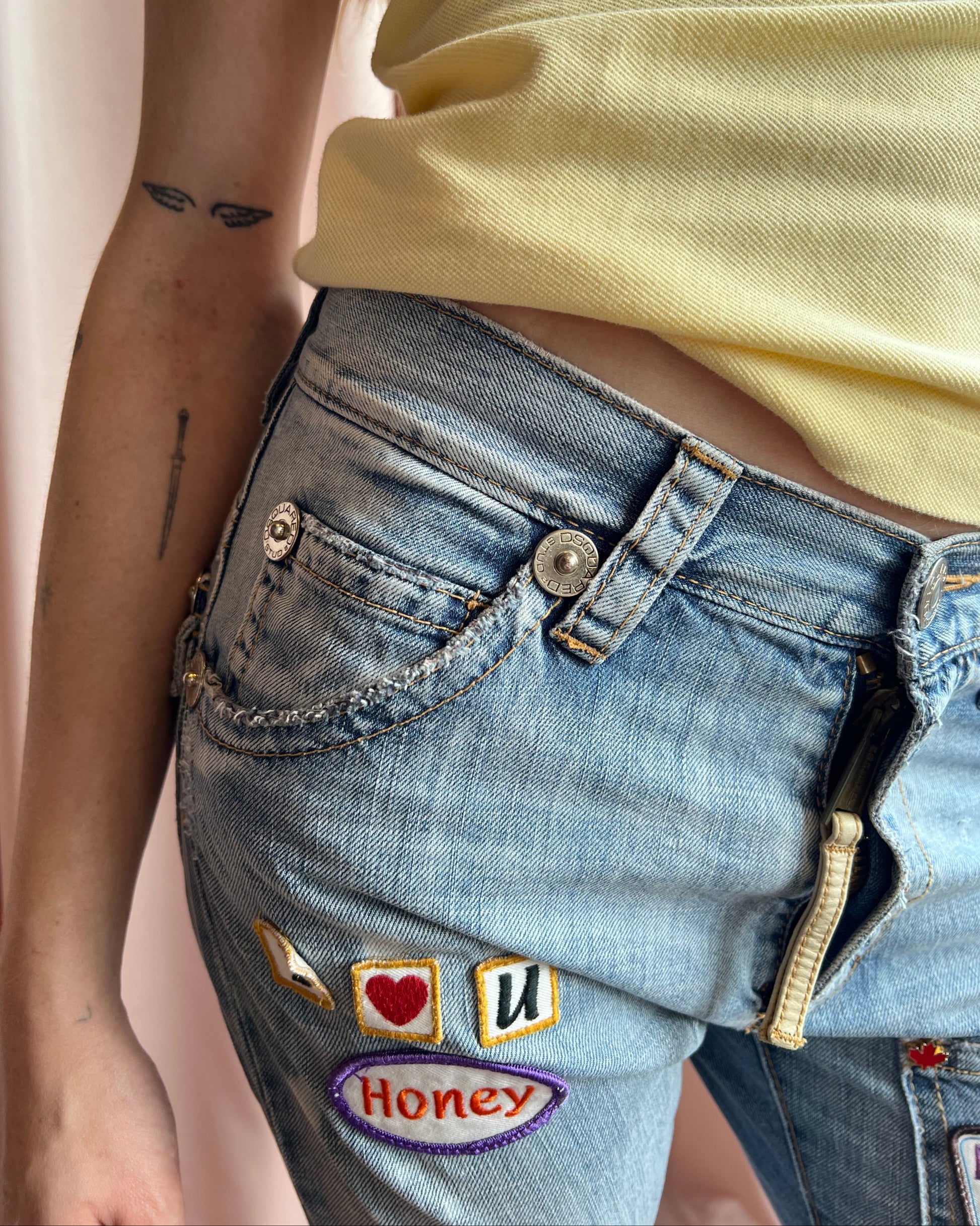 From Dsquared² Spring/Summer 2005 collection, as seen on the runway in the dark wash denim version. Low rise cropped denim meant to fit baggy at the waist and slim at the leg. Coming in a light wash denim with various fun and vulgar text patches throughout.