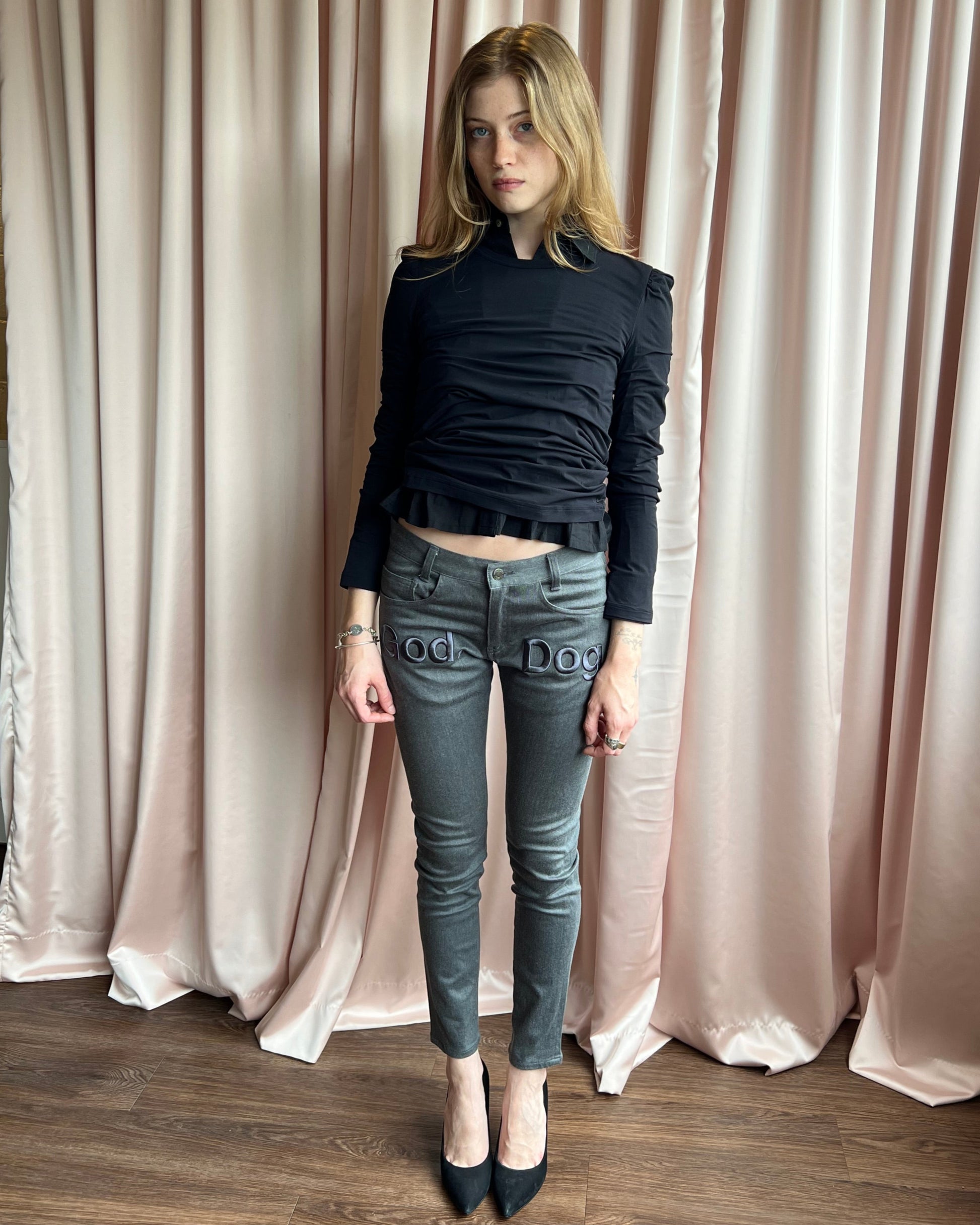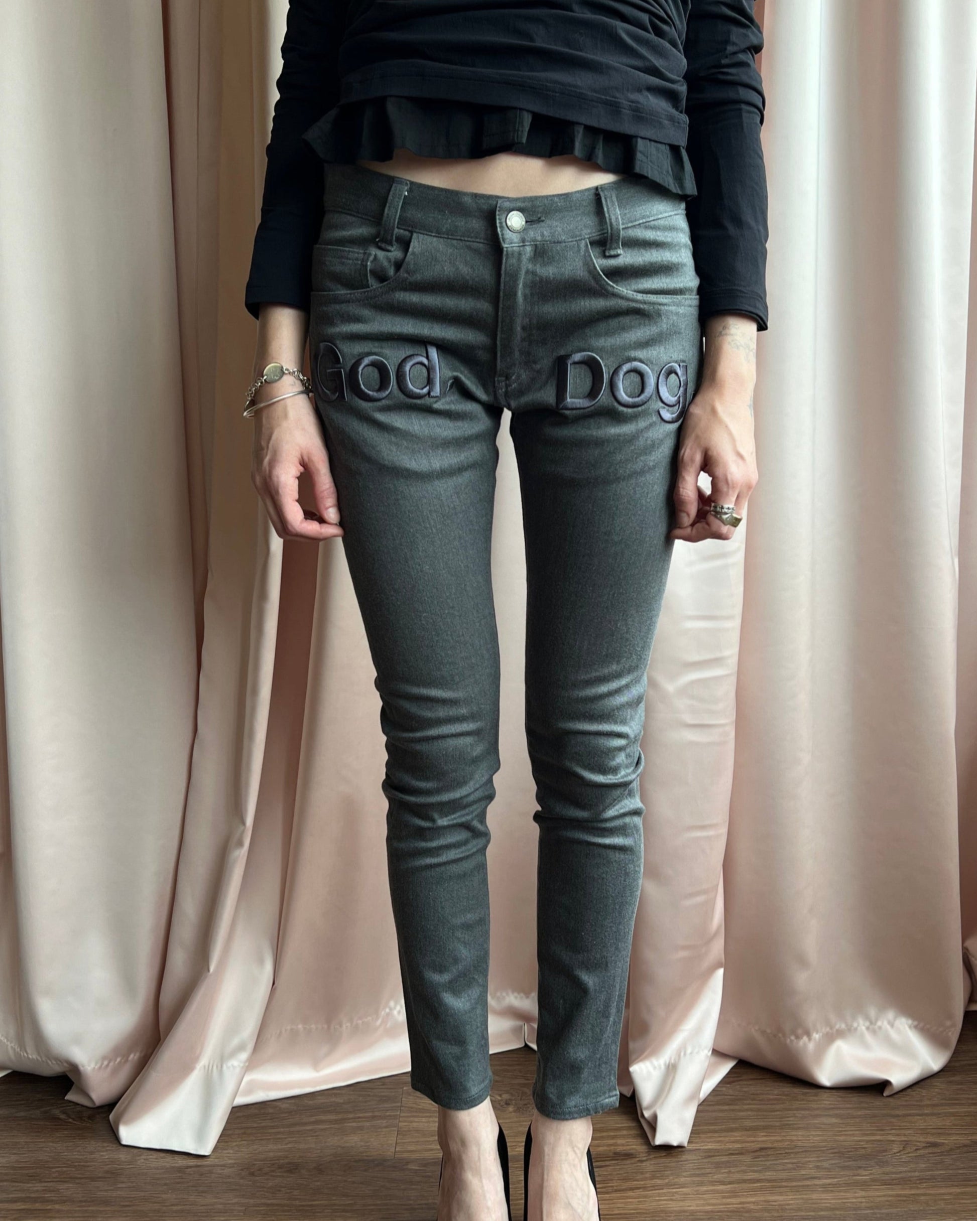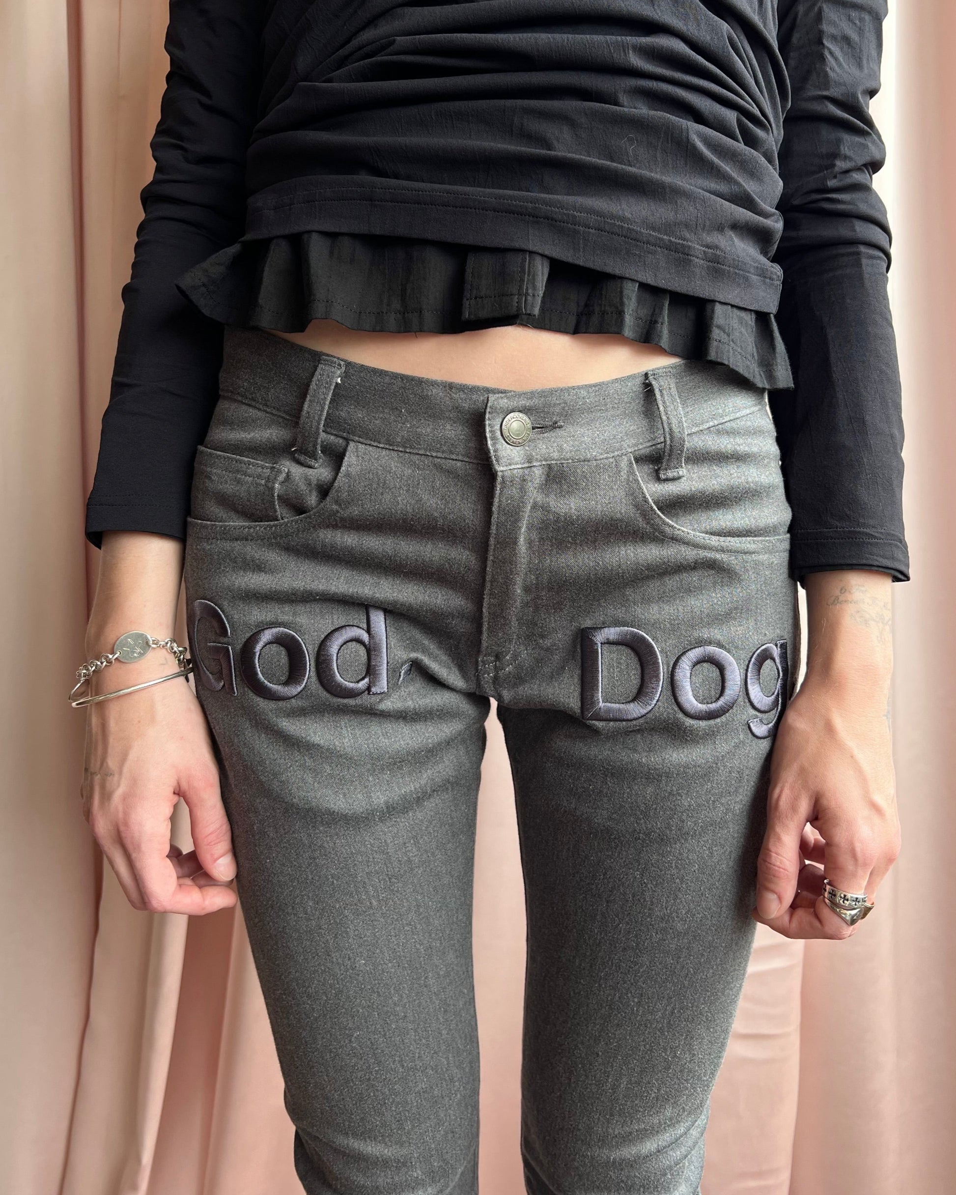 From Undercover’s Spring/Summer 2014 collection by Jun Takahashi titled “GODDOG”. Grey slim cut trousers spelling out “God. Dog.” in bold embroidered lettering across the thighs.